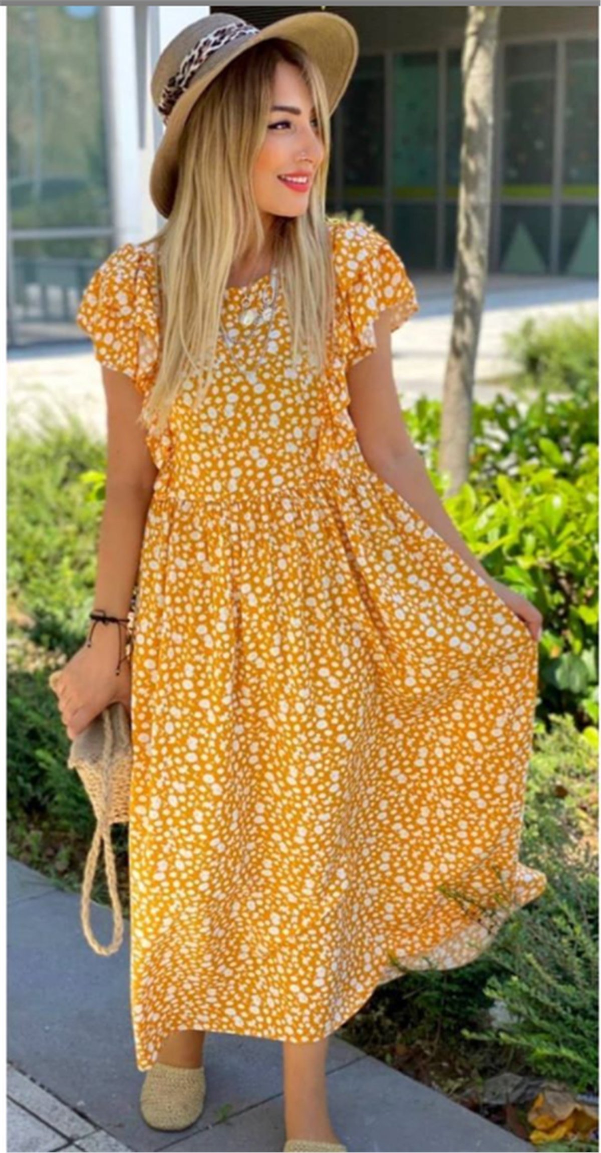 Desenli Midi Boy Elbise Sarı (M-1196)